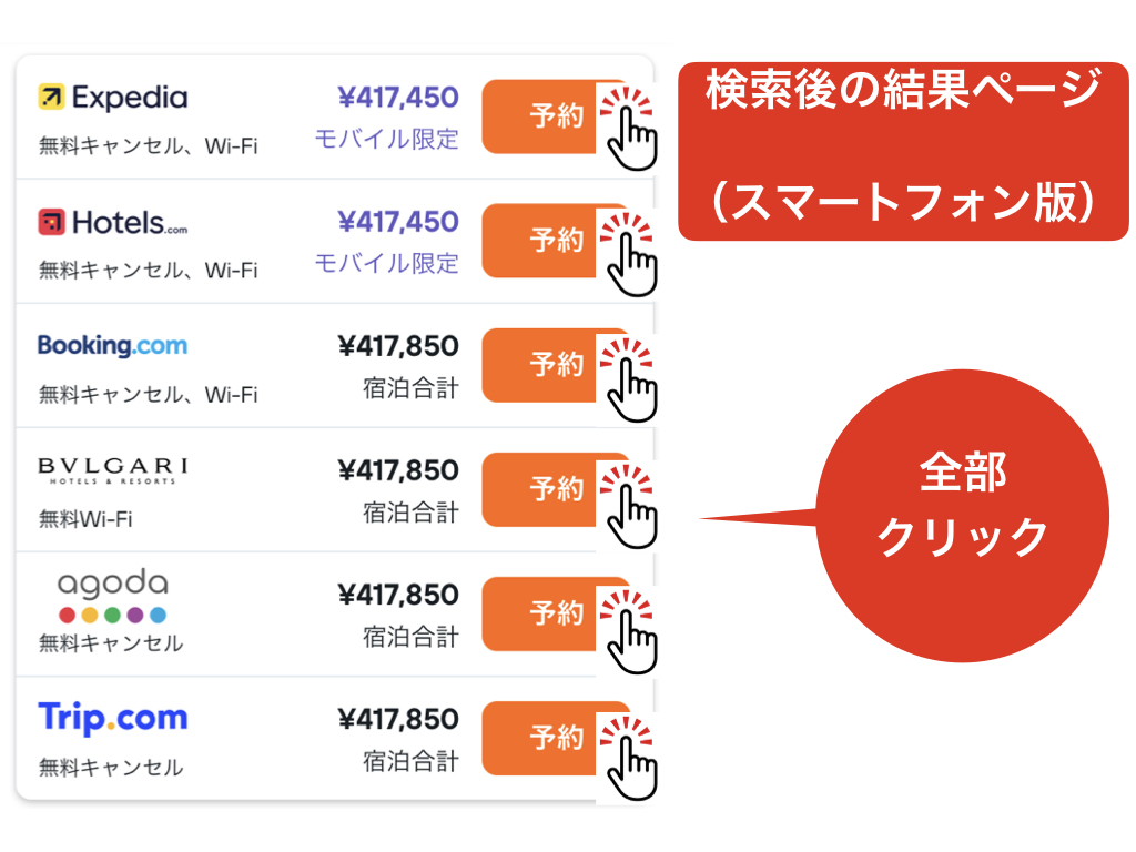 簡単にお好みのホテル・旅館を検索して各旅行サイトの料金を比較できます。目的地を入力し、日付を選択するだけで宿泊料金を比較。料金や距離(例:街の中心からの距離)、宿のランク、館内施設などの条件絞り込み機能使って検索を絞り込むことも可能。格安の宿から高級ホテルまでネット予約が簡単にできます。多種多様な宿泊プランが揃い、海外で人気のソウル 台北 ホノルル バンコク シンガポール グアム ローマ パリ ロンドン ニューヨーク ロサンゼルス トロント バンクーバーなどの都市から、東京・大阪・京都・沖縄・札幌や名古屋など国内都市まで幅広い選択肢の中から検索できます!