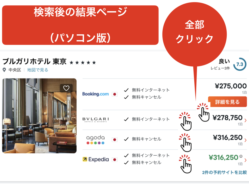 ■「行き先と日付」を入力するだけで簡単に横浜のご希望ホテルの最安値がわかります。